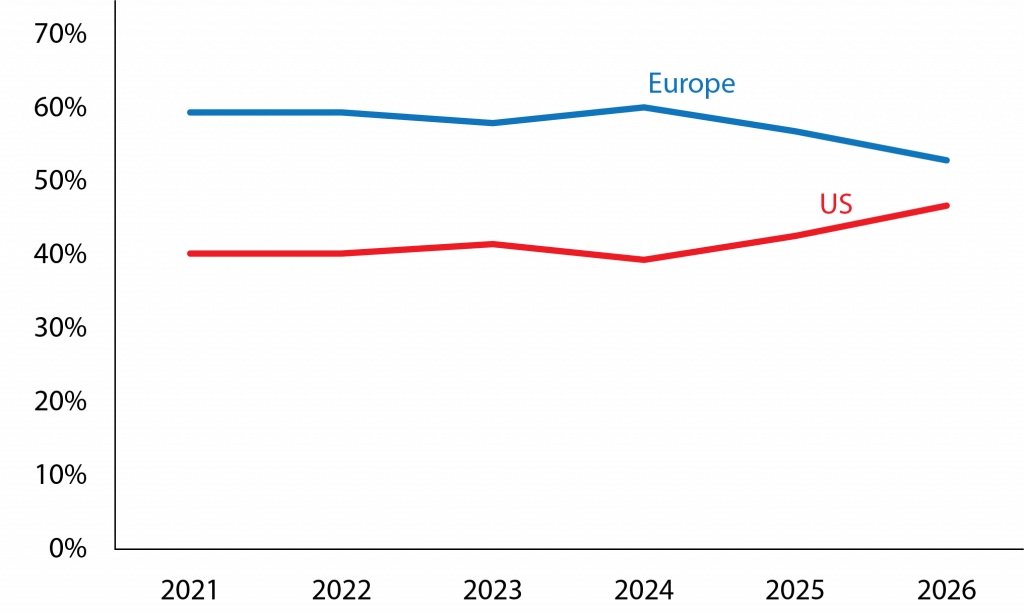 Asset managers are generally ranked by assets under management. Table 1 shows the European market shares of the top 20 asset managers. It appears that the top 20 cover over 60 percent of the European asset management market. Figure 1 summarises the results. The European market share of European (EU, United Kingdom and Swiss) asset managers has declined since 2021, while the share of US asset managers has increased from 40 percent in 2021 to 47 percent in 2026.