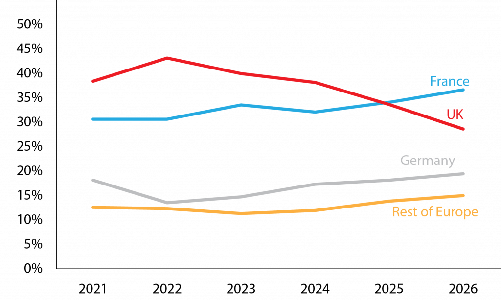 The dynamics among European asset managers are also interesting. Figure 2 shows that French asset managers are on the rise, from 31 percent of European asset managers in 2021 to 37 percent in 2026, while the UK share of European asset managers has declined from 43 percent in 2021 to 29 percent in 2026. German asset managers hover around 18 percent to 20 percent of European asset managers. French asset managers, similarly to French investment banks, are dominant within the European sub-segment of the European capital market. This confirms the important position of Paris in the EU capital market.