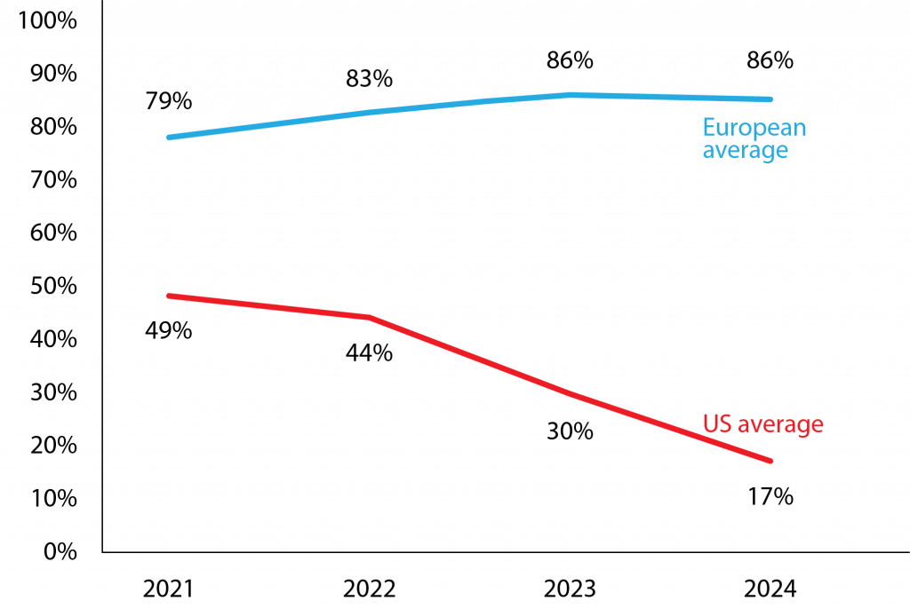 Figure 4 shows that European asset managers have a track record of voting in favour around 80 percent of the time, while voting in favour by US asset managers dropped from 49 percent in 2021 to 17 percent in 2024.