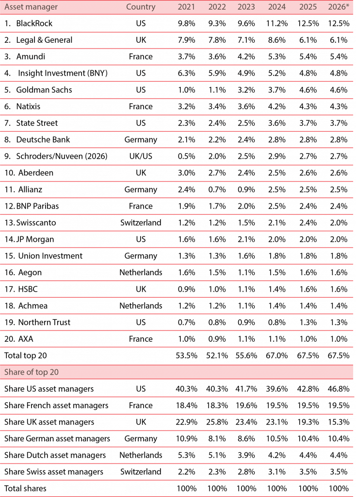 Table 1. Top 20 asset managers, % of European assets under management