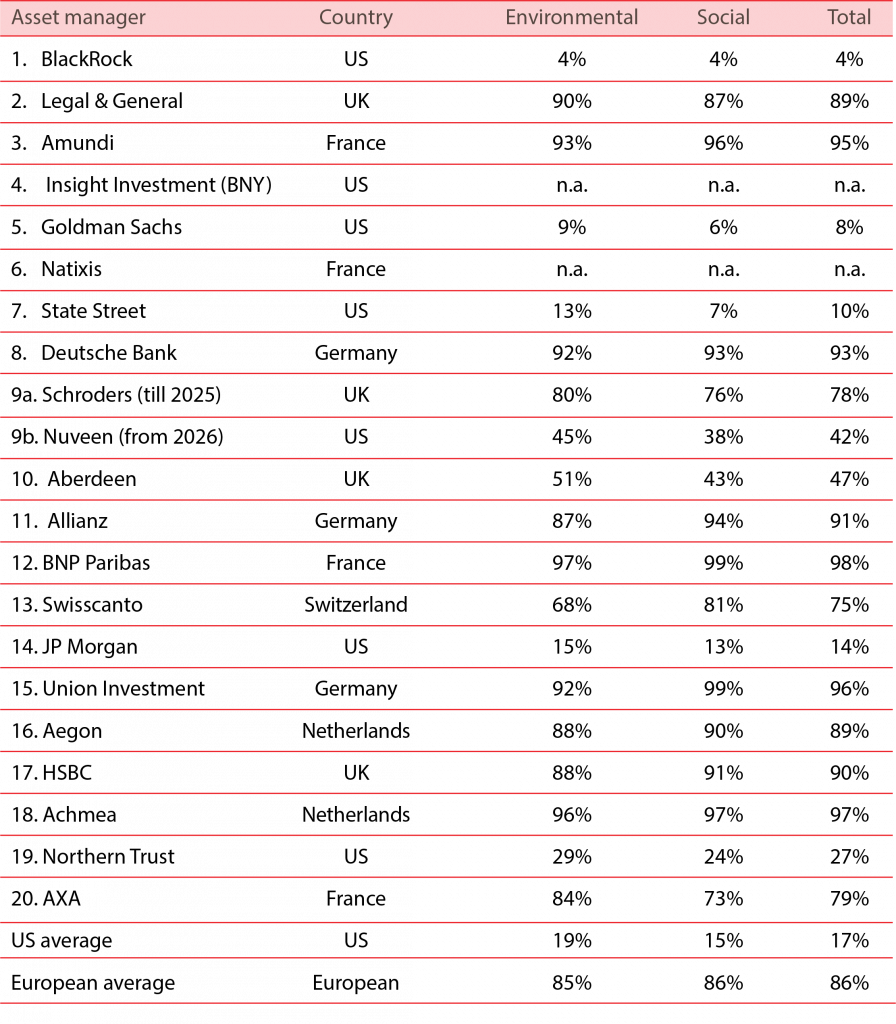 Table 2 shows a clear dividing line between US and European asset managers in this respect. US asset managers (in particular the larger ones, including BlackRock, State Street and Goldman Sachs) tend to vote against social and environmental resolutions, while Euro-pean asset managers vote largely in favour.